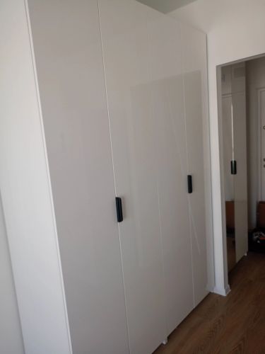 Снимем старые дверцы. Вырежем отверстия под петли, сделаем разметку и прикрепим ручки. Навесим и отрегулируем новые дверцы. Работа займёт 30–60 мин. Будет шумно.